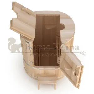 Овальная фитобочка из кедра - это мини парная, которую можно использовать не только в спа-салонах, но и дома. Овальная модель более просторна и удобна в использовании. Толщина стенок составляет 25 мм. Она оборудована откидными створками, дверцей и отверстием для головы. Во время парения человек сидит внутри кедровой бочки, а голова находится снаружи. Благодаря этому исключается возможность перегрева. Подлокотники из кедра, встроенные ручки на створках и двери делают эксплуатацию более удобной.