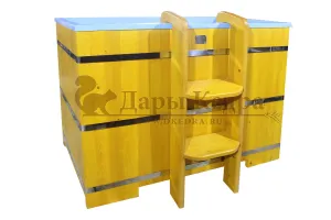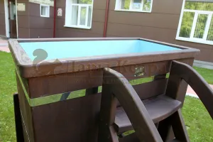 Это емкость для воды с прямоугольной пластиковой чашей. Купель предназначена для отдыха и охлаждения тела после процедур парения. Подходит для уличного и комнатного использования. Для удобства пользования овальная купель с пластиковой вставкой оснащена лавочками, приставной и внутренней лестницей из кедра.