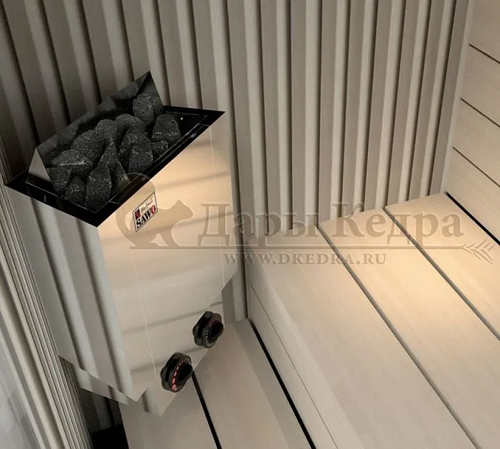 Финская домашняя парная имеет достойную базовую комплектацию, в которую входят: полок, подспинник, трапик для ног, дверь с закаленным стеклом в раме, двойные стенки с теплоизолирующей плёнкой, ограждение из кедра вокруг печи, светильник с абажуром, паспорт изделия, электрическая печь Sawo Nordex с пультом управления для более комфортного принятия процедуры.